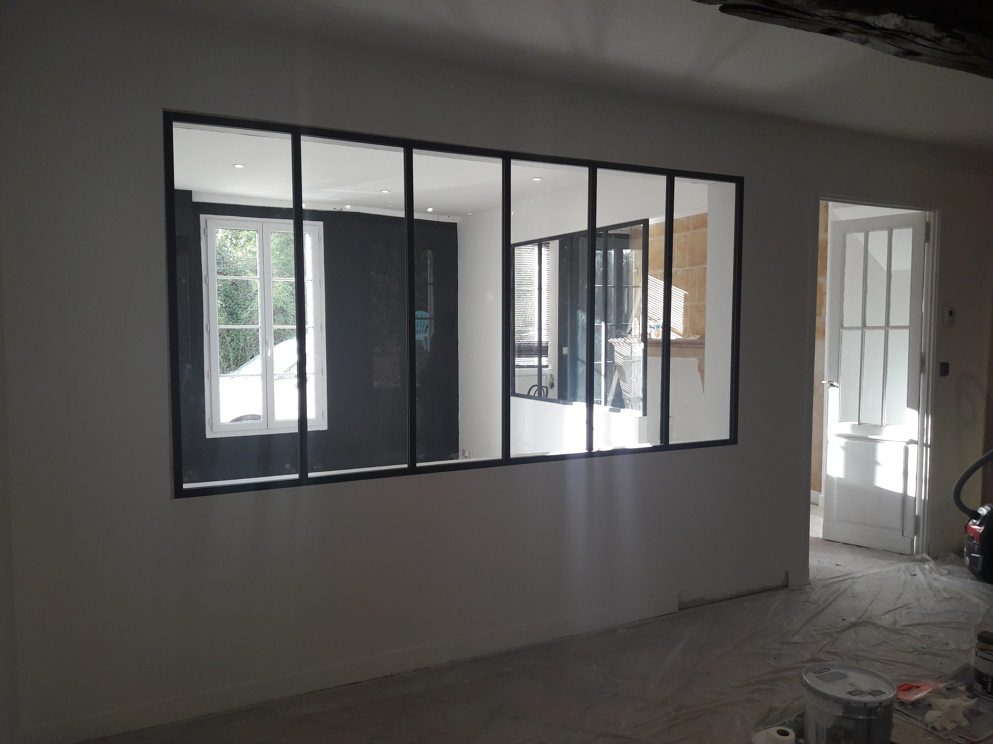 Pose de verrières sur mesure en alu gris foncé RAL 7016 pour séparer tout en laissant entrer la lumière dans la salle de jeu et la grande pièce à vivre. Aménagement proposé par Anne-Valérie Chazalet de Act Intérieur